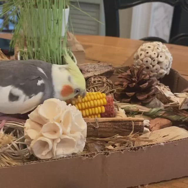 Foraging Flats were designed after seeing the wonderful video shown above of a customer's Cockatiel digging through natural goodies. So often, we try to promote this kind of foraging but at the same time, are also aware that many of our customers don't have the time or all the supplies needed to create their own. Which is why we decided to take all the hard work out! These come pre-assembled. Simply shake to "fluff up" the contents, unwrap, and then toss a portion of your parrot's favorite treat inside. Everything inside the packaging is safe and non-toxic. Simply lay it on a safe, flat surface and watch your feathered kid go to town!