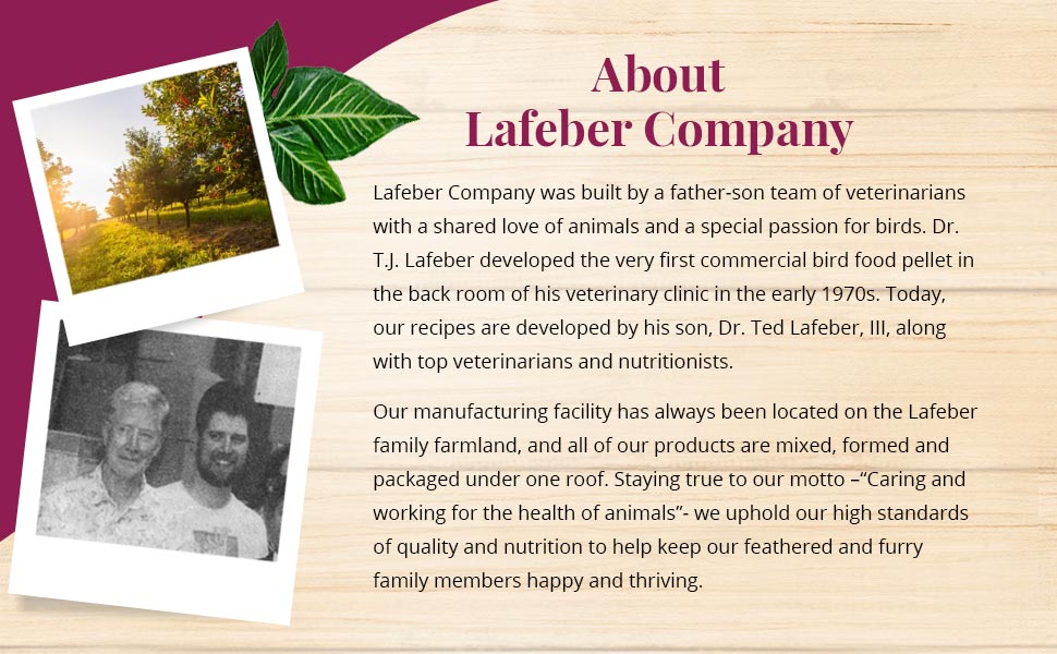 Any Lafeber food may also be fed as a treat. We recommend that pet birds also be offered bird-safe fresh vegetables each day and occasional fruits. Combined, these should never exceed 10 to 20% of your bird's daily food.