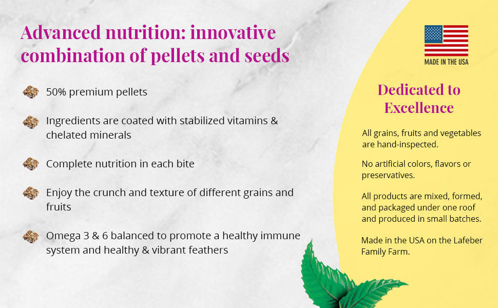 Soybean Meal, Ground Corn, Canary Grass Seed, Red Millet, White Proso Millet, Wheat Flour, Maltodextrin, Dried Fruit (Papaya, Cranberry, Pineapple, Mango, Date), Hulled Oats, Corn Syrup, Peanuts, Sucrose, Dicalcium Phosphate, Ground Limestone, Glycerin, Canola Oil, Dried Whole Egg, Vegetable Gelatin, Hydrolyzed Soy Protein, Iodized Salt, Ground Rice, Choline Chloride, DL-Methionine, L-Lysine, Citric Acid, Acacia Gum, Vitamin E Supplement, Manganese Proteinate, Ascorbic Acid, Manganous Oxide, Niacin Supplement, Zinc Proteinate, Zinc Oxide, Beta-Carotene, D-Calcium Pantothenate, Biotin, Copper Sulfate, Copper Proteinate, Riboflavin Supplement, Sodium Selenite, Pyridoxine Hydrochloride, Vitamin A Supplement, Thiamine Mononitrate, Tocopherols, Vitamin B12 Supplement, Folic Acid, Vitamin D3 Supplement.