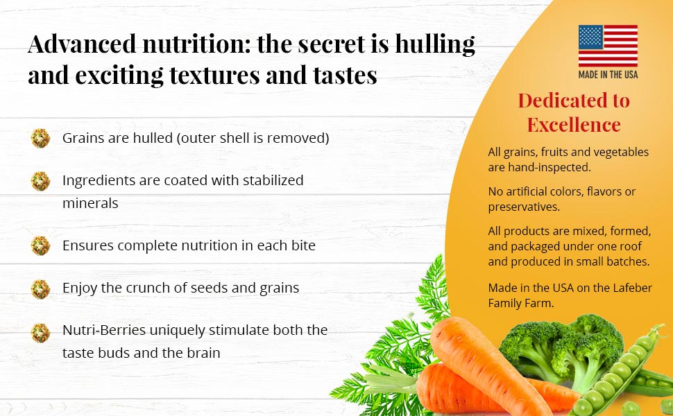 Corn, Hulled White Proso Millet, Hulled Oats, Maltodextrin, Red Millet, Safflower, Soybean Meal, Peanuts, Dried Vegetables (Carrots, Peas, Broccoli), Wheat Flour, Corn Syrup, Glycerin, Dicalcium Phosphate, Ground Limestone, Canola Oil, Hydrolyzed Soy Protein, Ground Rice, Corn Gluten Meal, Carrageenan, Iodized Salt, DL-Methionine, Citric Acid, Xanthan Gum, Choline Chloride, Vitamin E Supplement, Ascorbic Acid, Niacin Supplement, Manganous Oxide, Beta-Carotene, D-Calcium Pantothenate, Biotin, Zinc Oxide, Riboflavin Supplement, Sodium Selenite, Pyridoxine Hydrochloride, Vitamin A Supplement, Thiamine Mononitrate, Vitamin B12 Supplement, Tocopherols, Folic Acid, Copper Methionine Chelate, Vitamin D3 Supplement.
