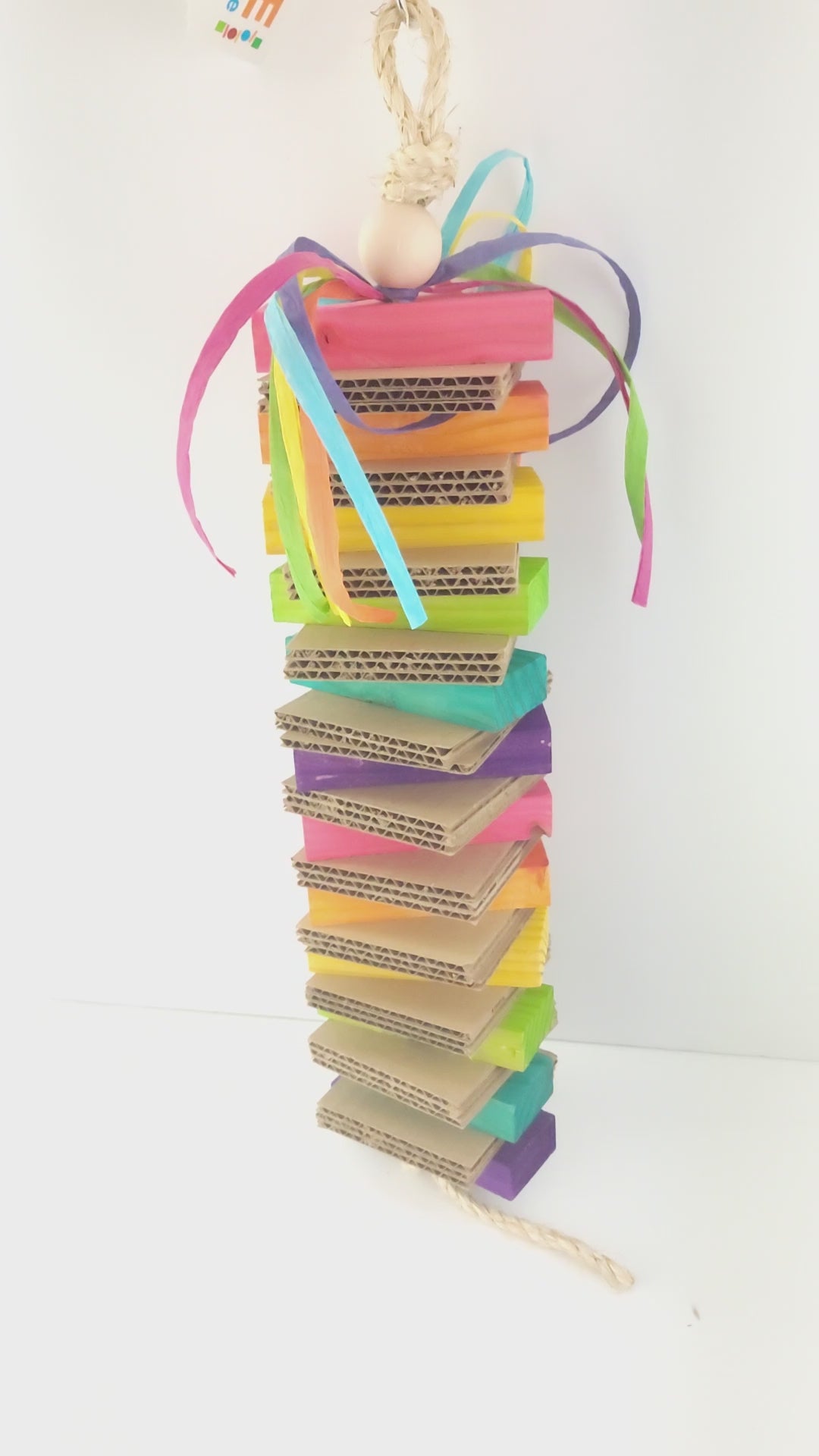 Get ready for a colorful adventure with Lola Rainbow by Bite Me Birdie! This 18" x 4" toy is filled with rectangular pine blocks, cardboard squares, and topped with paper ribbons and a wooden bead on a sisal rope. Let your bird explore and play with this vibrant and stimulating toy.
