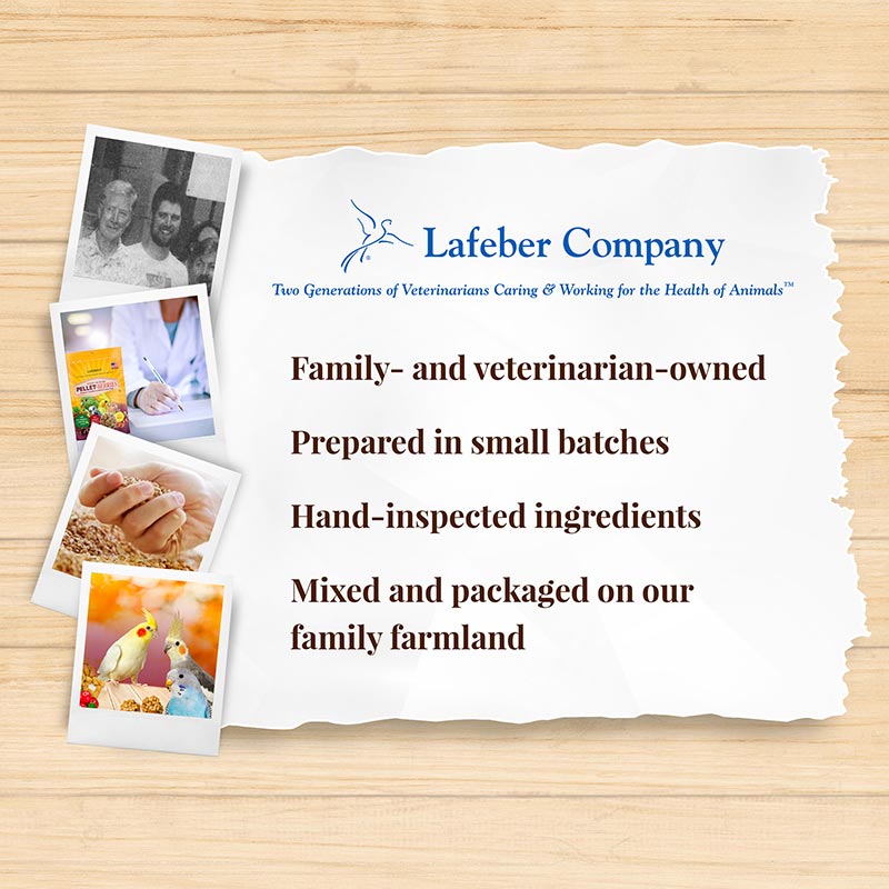 Any Lafeber food may also be fed as a treat. We recommend that pet birds also be offered bird-safe fresh vegetables each day and occasional fruits. Combined, these should never exceed 10 to 20% of your bird's daily food.
